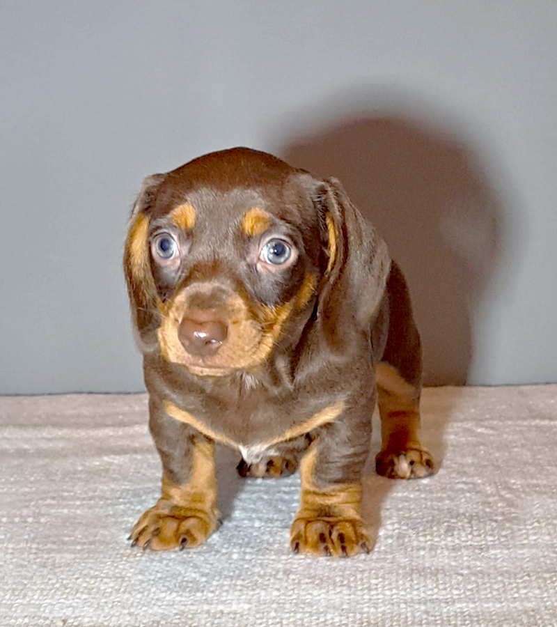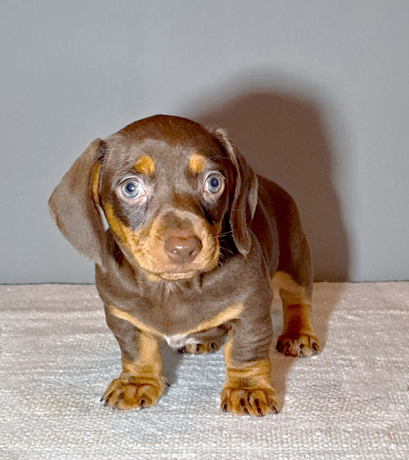 Este hermoso cachorrito Salchicha Dachshund Macho color Chocolate es una verdadera ternura con patitas cortas. Su pelaje liso y brillante en tono marrón intenso resalta sus ojitos claros y expresivos, haciéndolo un ejemplar encantador de la raza Dachshund. Su cuerpo alargado, orejitas caídas y personalidad dulce lo convierten en un compañero ideal para cualquier tipo de hogar.